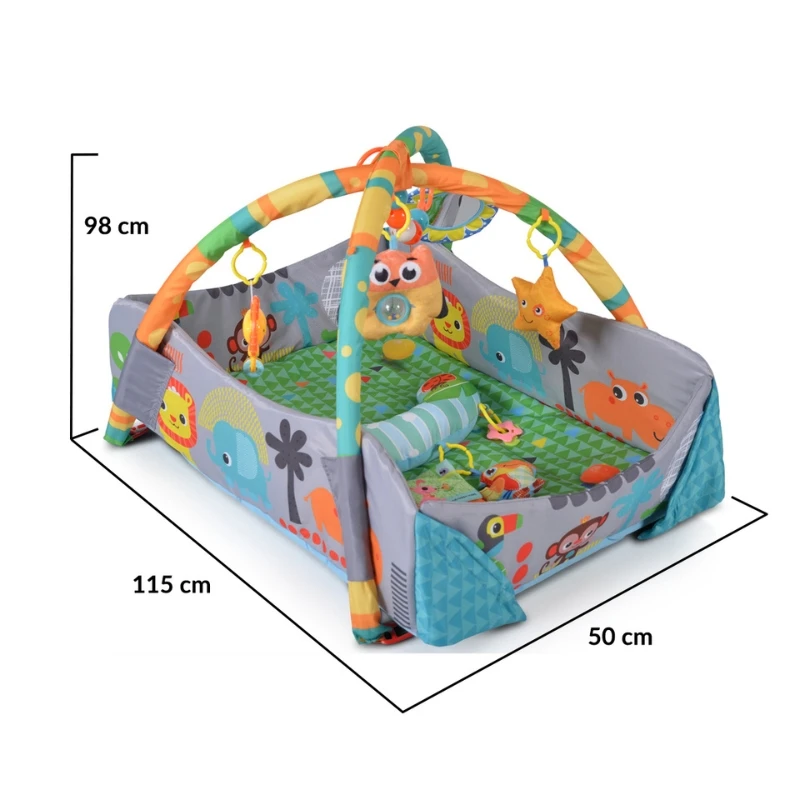 Cangaroo Oasis podloga u sivoj boji pogodna je za bebe starije od 6 meseci. Postoji mogućnost korišćenja podloga u 3 pozicije - na leđima, na stomaku i u sedećem položaju sa uključenim nekoliko mekanih igračaka i odvojivim lukovima za igračke. Napravljena je od netoksičnih materijala, bezbednih za zdravlje dece. Ima funkciju za zatvaranje sve 4 strane. Ovaj podloga stimuliše intelekt deteta, motoriku ruku i stopala, prepoznavanje različitih oblika i boja.