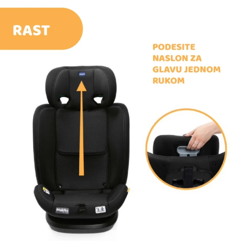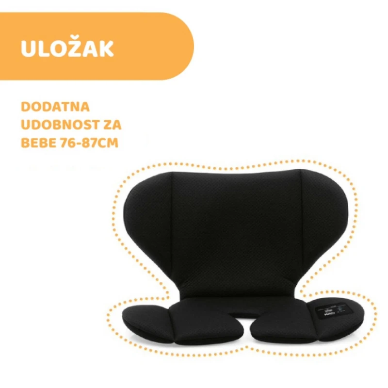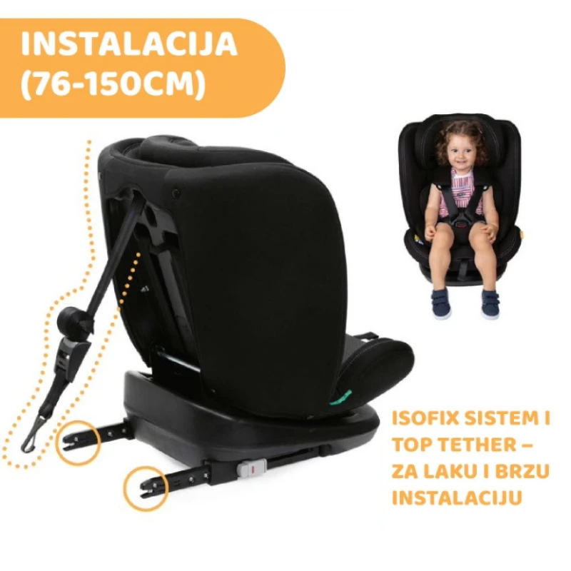 Chicco Unico Evo i-Size auto sedište u crnoj boji namenjeno je deci visine 40-150cm, odnosno deci uzrasta od rođenja do oko 12 godina. Deca visine 40-87cm treba da se voze u smeru suprotnom od smera vožnje, vezani pojasom u 5 tačaka vezivanja. Deca visine 76-105cm treba da se voze u smeru vožnje, vezani pojasom u 5 tačaka vezivanja. Dok deca visine 100-150cm treba da se voze u smeru vožnje, vezani pojasom automobila. Isofix konektori i Top tether obezbeđuju laku i sigurnu instalaciju sedišta (40-105cm). Sistem rotacije 360° omogućava laku promenu smera u kojem će sedište biti postavljeno, a takođe olakšava roditeljima pristup detetu. Mekani uložak za novorođenče obezbeđuje sigurnost i udobnost za najmlađe (40-60cm). Naslon za glavu se može podesiti po visini simultano sa pojasom kako bi savršeno ispratio rast deteta. Naslon za leđa se može podesiti u 5 položaja nagiba, bilo da je sedište okrenuto u smeru vožnje ili obrnuto.