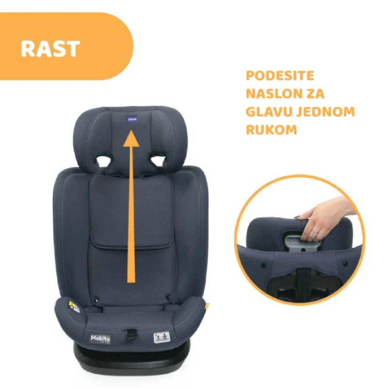 Chicco Mokita i-Size auto sedište u crnoj boji pogodno je za decu od 76 do 150cm, odnosno od 15 meseci do otprilike 12 godina. Za decu visine 76-105cm je moguća instalacija samo sa isofix konektorima, dok je za decu visine 100-150cm instalacija moguća sa ili bez isofix konektora. Mekani uložak obezbeđuje dodatnu udobnost za najmlađe (76-87cm). Naslon za glavu se može podesiti po visini simultano sa pojasom kako bi savršeno ispratio rast deteta. Naslon za leđa se može podesiti u 4 položaja nagiba, što garantuje udobnu vožnju za decu.