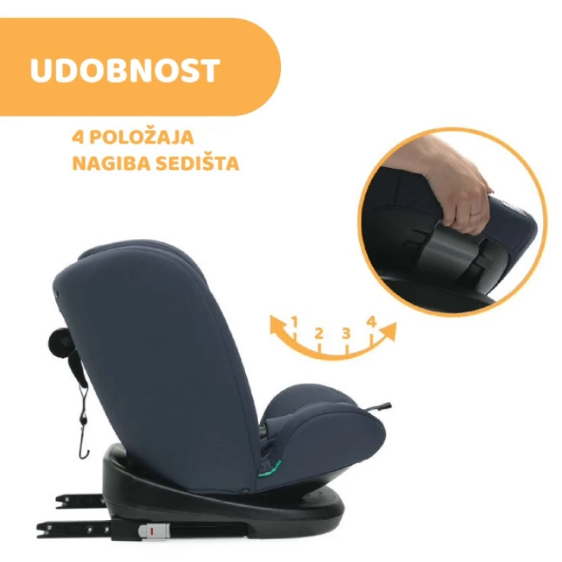 Chicco Unico Evo i-Size auto sedište u plavoj boji namenjeno je deci visine 40-150cm, odnosno deci uzrasta od rođenja do oko 12 godina. Deca visine 40-87cm treba da se voze u smeru suprotnom od smera vožnje, vezani pojasom u 5 tačaka vezivanja. Deca visine 76-105cm treba da se voze u smeru vožnje, vezani pojasom u 5 tačaka vezivanja. Dok deca visine 100-150cm treba da se voze u smeru vožnje, vezani pojasom automobila. Isofix konektori i Top tether obezbeđuju laku i sigurnu instalaciju sedišta (40-105cm). Sistem rotacije 360° omogućava laku promenu smera u kojem će sedište biti postavljeno, a takođe olakšava roditeljima pristup detetu. Mekani uložak za novorođenče obezbeđuje sigurnost i udobnost za najmlađe (40-60cm). Naslon za glavu se može podesiti po visini simultano sa pojasom kako bi savršeno ispratio rast deteta. Naslon za leđa se može podesiti u 5 položaja nagiba, bilo da je sedište okrenuto u smeru vožnje ili obrnuto.