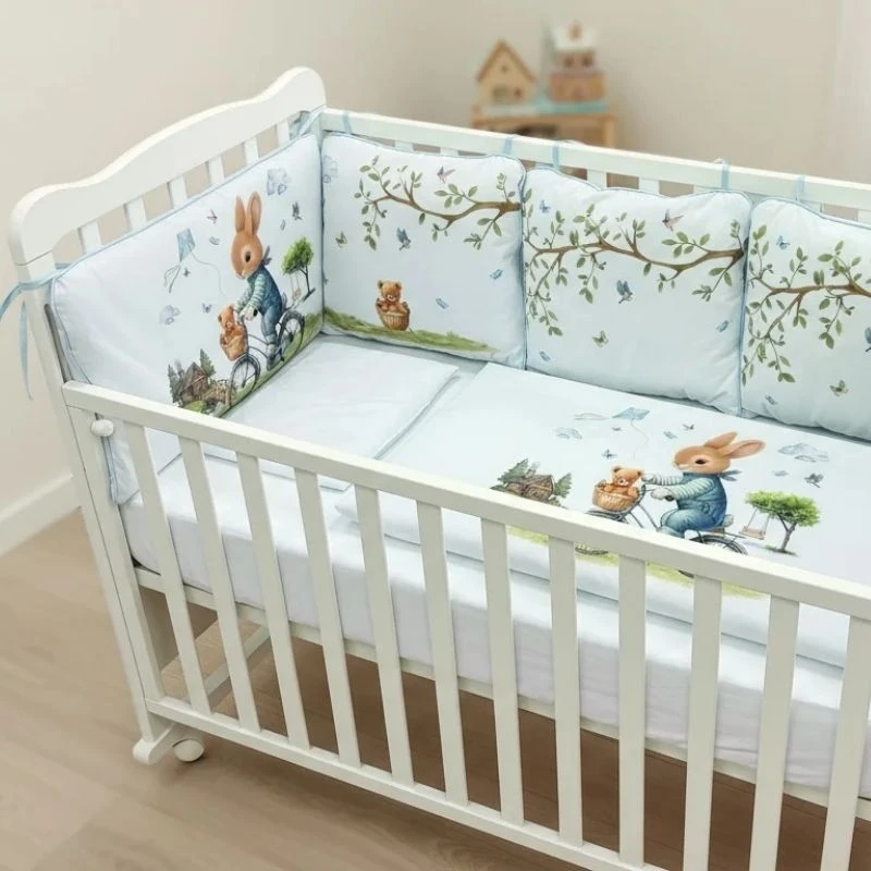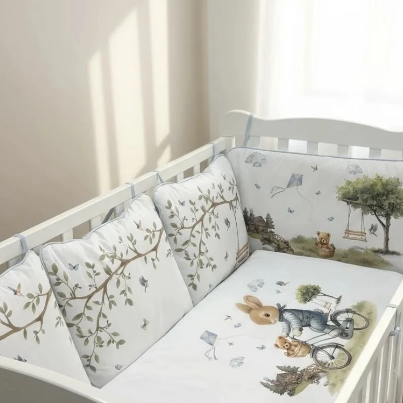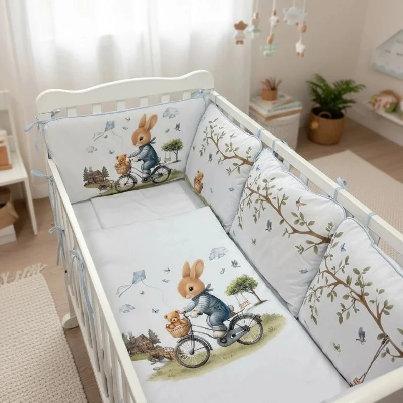 Posteljina sa ogradicom Tri drugara u Parizu u bež boji je punjena posteljina za krevetac, dimenzija 120 cm x 60 cm, koja odgovara standardnim dimenzijama kreveca. Sve ogradice, jastuci i prekrivač imaju nezavisno punilo, koje se po potrebi može odstraniti. Izrađena je od mekog, prijatnog pamuka vrhunskog kvaliteta, prilagođenog potrebama novorođenčeta.
