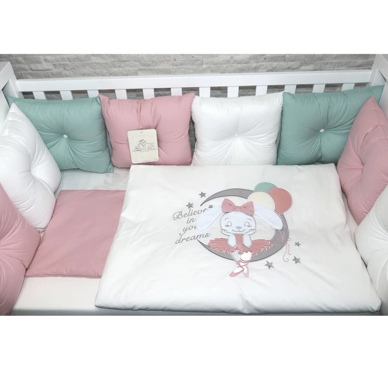 - Kompletić se sastoji od 8 jastučića, jastuka za spavanje, jorganičićem i jorganskom navlakom i donjim čaršavom sa lastišem.