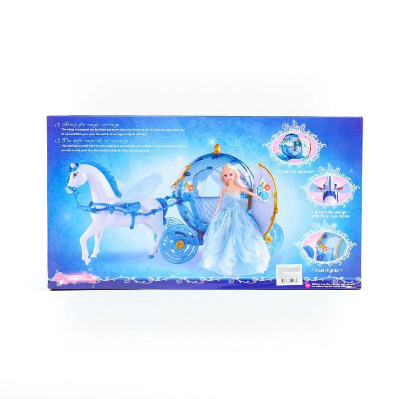 HK Mini igračka set konjić sa kočijom je bajkoviti set koji sadrži kočiju i figuru konja u nežnim tonovima roze boje. Kočija je kružnog oblika, izrađena od providne plastike, sa vratima koja se otvaraju. Figura konjića ima krila - ona se stvarno pokreću i daju utisak da konjić leti i na taj način vuče kočiju. Konjić je izrađen od plastike, a griva i rep su od dlake od koje se mogu praviti razne frizure.