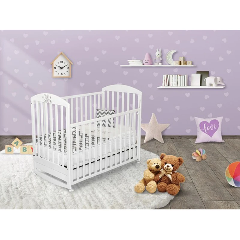 Krevetić za bebe Nina sa fiokom i klackalicom u beloj boji, domaće proizvodnje, pogodan je za bebe od rođenja. Prednja rešetka kreveca se spušta i ima tri nivoa visine, a može se i potpuno ukloniti. Pod kreveca ima tri nivoa visine i možete ga podešavati u zavisnosti od uzrasta bebe i od toga koja vam visina dušeka u tom trenutku odgovara. Krevetac ima i praktične točkiće pomoću kojih se vrlo lako može pomerati. Materijal od kojeg je krevetic izrađen je bukovo drvo. Farba kojom je ofarban je neškodljiva po zdravlje dece. Ivice krevetića su zaobljene i čine ga bezbednim za mališane.