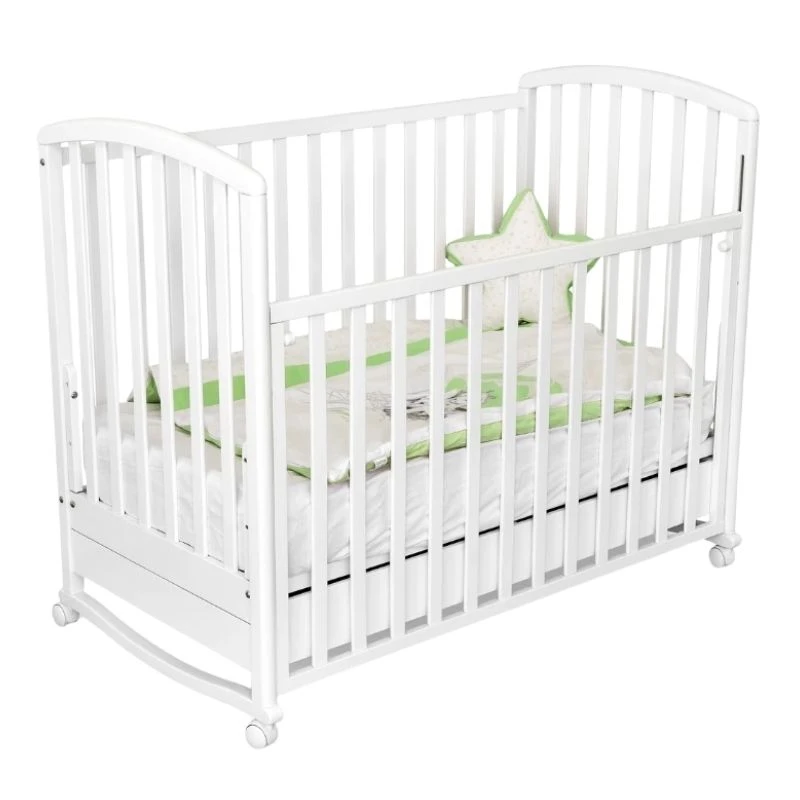 Drveni krevetac za bebe Kiki sa fiokom i klackalicom u beloj boji je domaće proizvodnje i veoma je praktičan i atraktivan. Materijal od kojeg je krevetic izrađen je bukovo drvo. Farba kojom je ofarban je neškodljiva po zdravlje dece. Ivice krevetića su zaobljene i čine ga bezbednim za mališane. Prednja rešetka kreveca se spušta i ima tri nivoa visine, a može se i potpuno ukloniti. Pod kreveca ima tri nivoa visine i moćete ga podešavati u zavisnosti od uzrasta bebe i od toga koja vam visina dušeka u tom trenutku odgovara. Krevetac je sa fiokom dubine 42 cm koja ide celom dužinom kreveca. Krevetac takođe ima i praktične točkiće pomoću kojih se vrlo lako može pomerati.