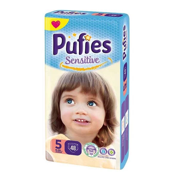 Pufies pelene sensitive MP 5 junior 11kg 48 kom su inovativne, dopadljive pelene koje prijaju koži. Gornji sloj obogaćen svilenim vlaknima, kamilicom i Aloe Verom, pomaže kod smanjenja rizika od iritacije.