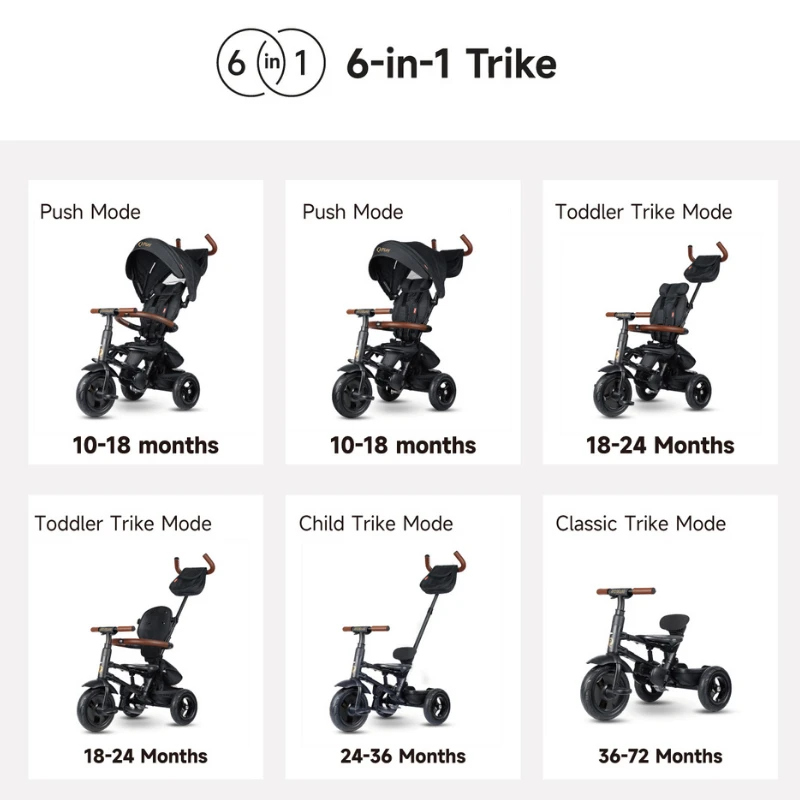 Rito Delux tricikl 6u1 u sivoj boji ima gume napunjene vazduhom, za razliku od ostalih modela koji imaju plastične točkove. Pogodan je za decu od 10 meseci do 6 godina, odnosno do maksimalne težine od 25kg. Rito Deluxe se lako sklapa radi lakog skladištenja i transporta, za razliku od većine tricikala za malu decu, što roditeljima olakšava nošenje tricikla u automobilima, javnom prevozu i čak na teškim terenima poput pokretnih stepenica.