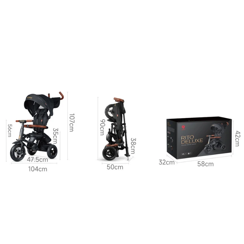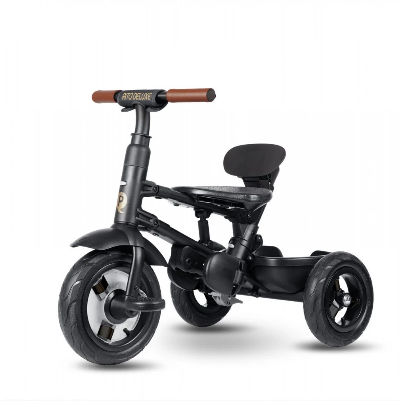 Rito Delux tricikl 6u1 u braon boji ima gume napunjene vazduhom, za razliku od ostalih modela koji imaju plastične točkove. Pogodan je za decu od 10 meseci do 6 godina, odnosno do maksimalne težine od 25kg. Rito Deluxe se lako sklapa radi lakog skladištenja i transporta, za razliku od većine tricikala za malu decu, što roditeljima olakšava nošenje tricikla u automobilima, javnom prevozu i čak na teškim terenima poput pokretnih stepenica.