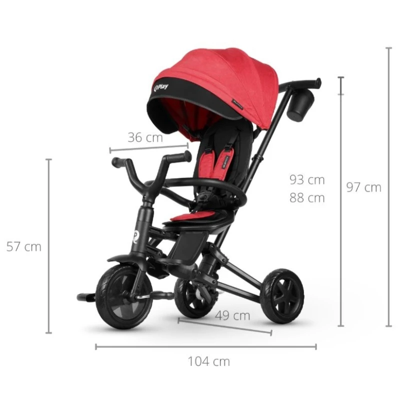 QPlay Rito Eva trcikl u crvenoj boji pogodan je za decu od 10 meseci do otprilike 6 godina, odnosno do maksimalno 25kg težine deteta. Rito tricikl je opremljen brojnim funkcijama koje olakšavaju svakodnevnu upotrebu. Sedište sa visokim naslonom i dva položaja nagiba, teleskopska ručka, sklopivi oslonac za noge, višedelna tenda sa UV zaštitom i sigurnosni pojas u 5 tačaka pružaju maksimalnu udobnost i sigurnost. Tricikl se lako sklapa do kompaktnih dimenzija, omogućavajući lako prenošenje i skladištenje, pa čak i vučenje kao kofer kada je sklopljen.
