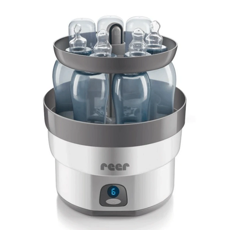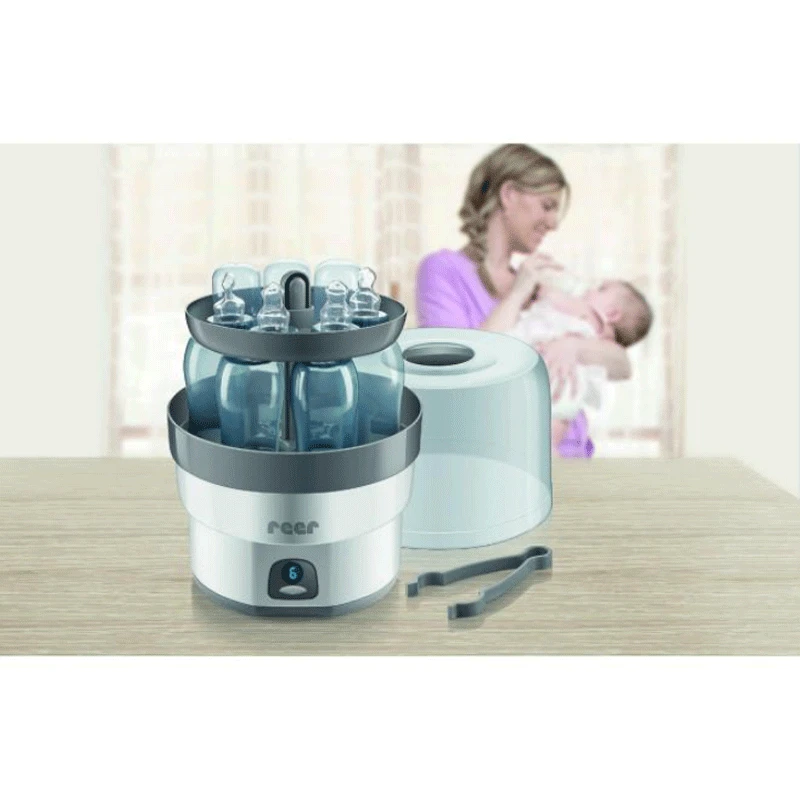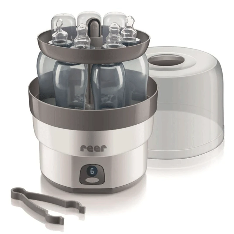 Reer mikrotalasni sterilizator brzo i efikasno steriliše flašice i dodatke. Uništava bakterije upotrebom pare, bez hemikalija. Pogodan je za sve vrste flašica sa uskim i širokim grlom.Mikrotalasni sterilizator možete očistiti običnim deterdžentom za pranje sudova. Možete ga i prati u mašini za pranje sudova.