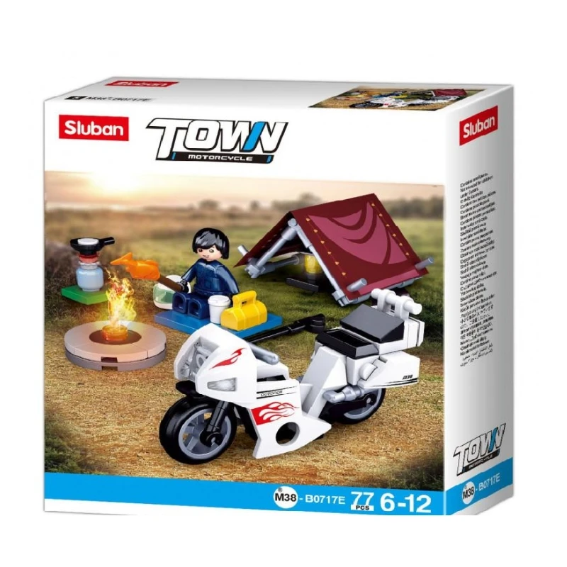Sluban kocke Vojska motocikl sastoje se od 109 kom kockica. Sluban kocke dolaze u kompletima koji obrađuju različite teme. Igrajući se njima, mališani na zabavan način, kroz igru , razvijaju kreativnost i stvaralačko izražavanje. Namenjene su deci starijoj od 6 god.