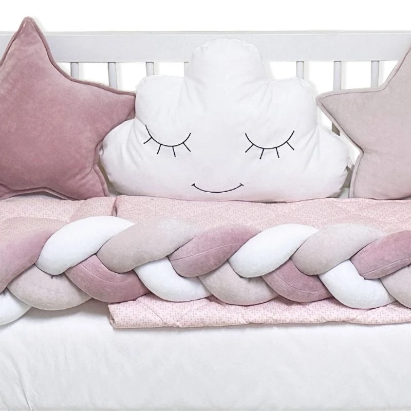 Textil šarena pletenica za krevetac - divna i elegantna u roze-sivo-beloj boji, potpuni dekor i zaštita kao ogradica za Vaš krevetac ali i praktična jer je možete koristiti i kasnije za dečiji veliki krevet.