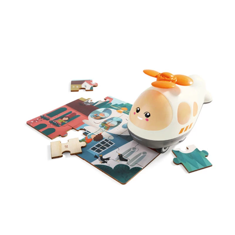 - Kada dete završi igru sa slagalicom, kroz otvor koji se nalazi na donjem delu plastične igračke HELIKOPTER - može da spakuje pazle i nastavi igru uz vožnju ovog četvorotočkaša.