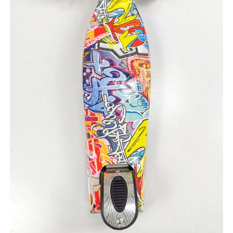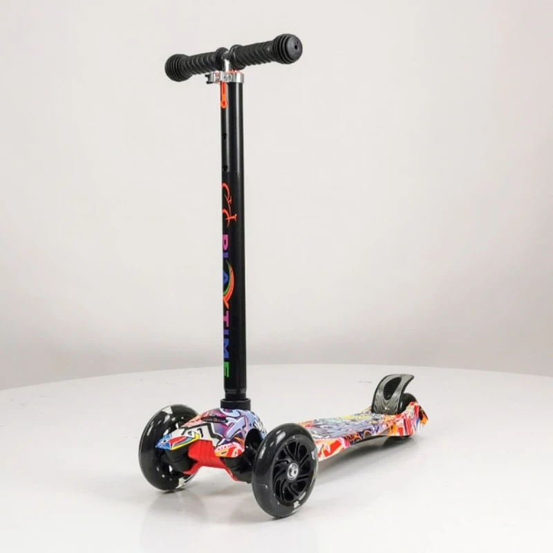 Trotinet u šareno-crnoj boji je predviđen za jedno dete. Izrađen je od veoma kvalitetnog aluminijumskog rama. Pogodan je za avanture u parkiću za decu stariju od 3 godina. Pri većoj brzini točkovi imaju svetleće efekte. Preporuceno maksimalno opterećenje do 35kg. Neka avantura počne.