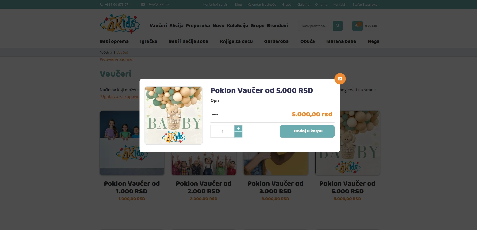 Klikom na željeni vaučer otvara se prozor sa detaljima (naziv, cena, slika).