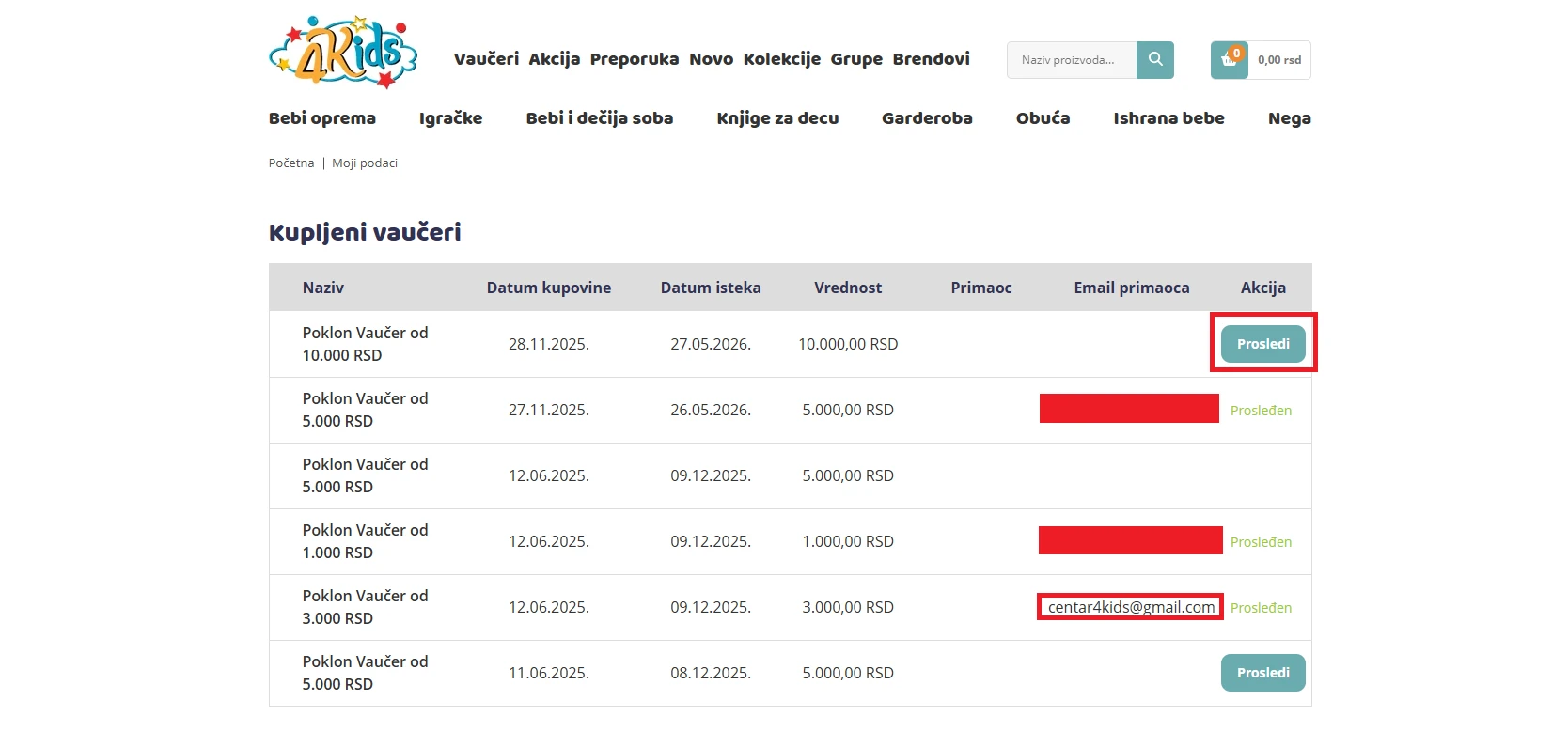 Kada kliknete na dugme „Prosledi“, otvara se prozor u kome unosite email osobe kojoj šaljete vaučer.