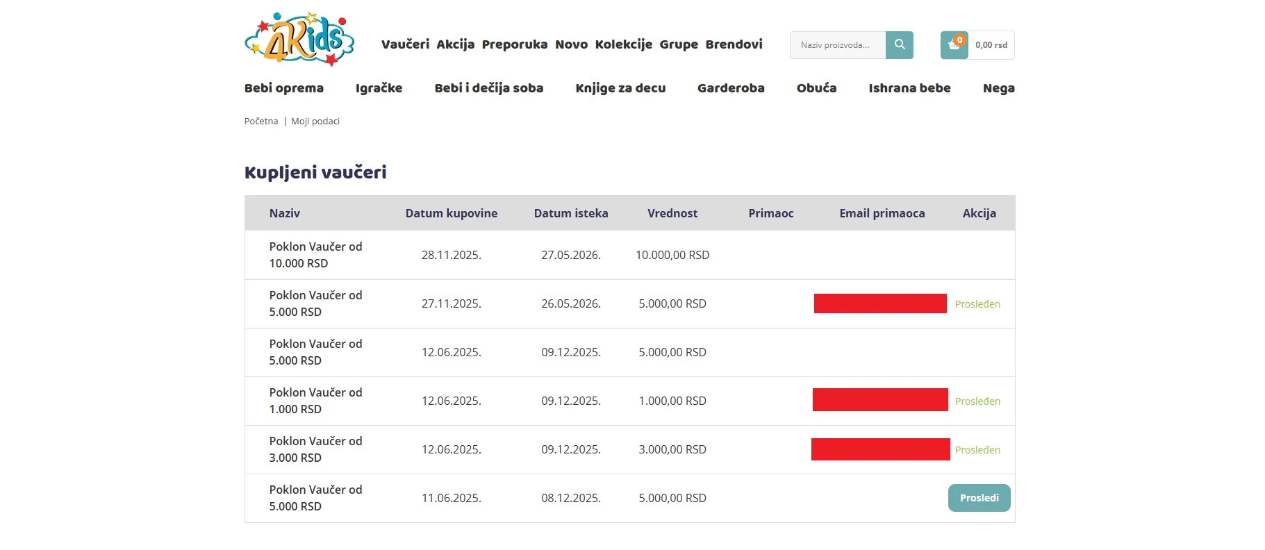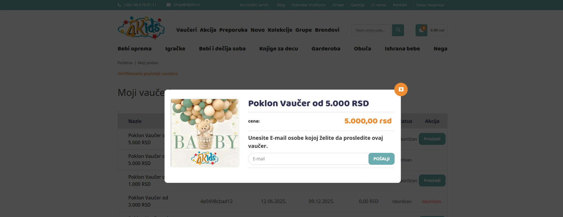 Tu vidite sve vaše Kupljene Vaučere, vrednost vaučera, datum kupovine i do kada se može iskoristiti vaučer.