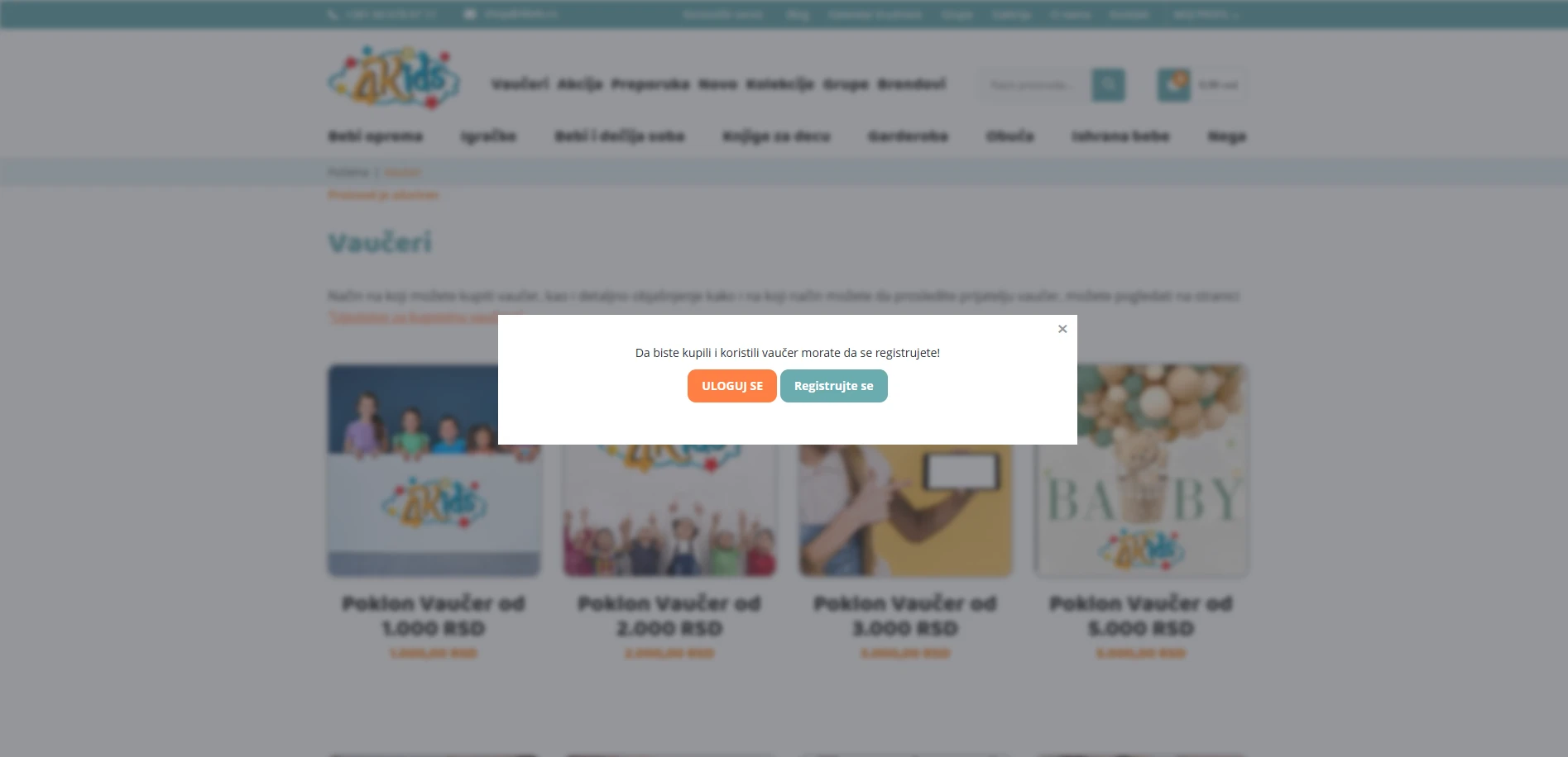 Kada kliknete na željeni vaučer, pojaviće vam se obaveštenje da je potrebna registracija ili prijava.
